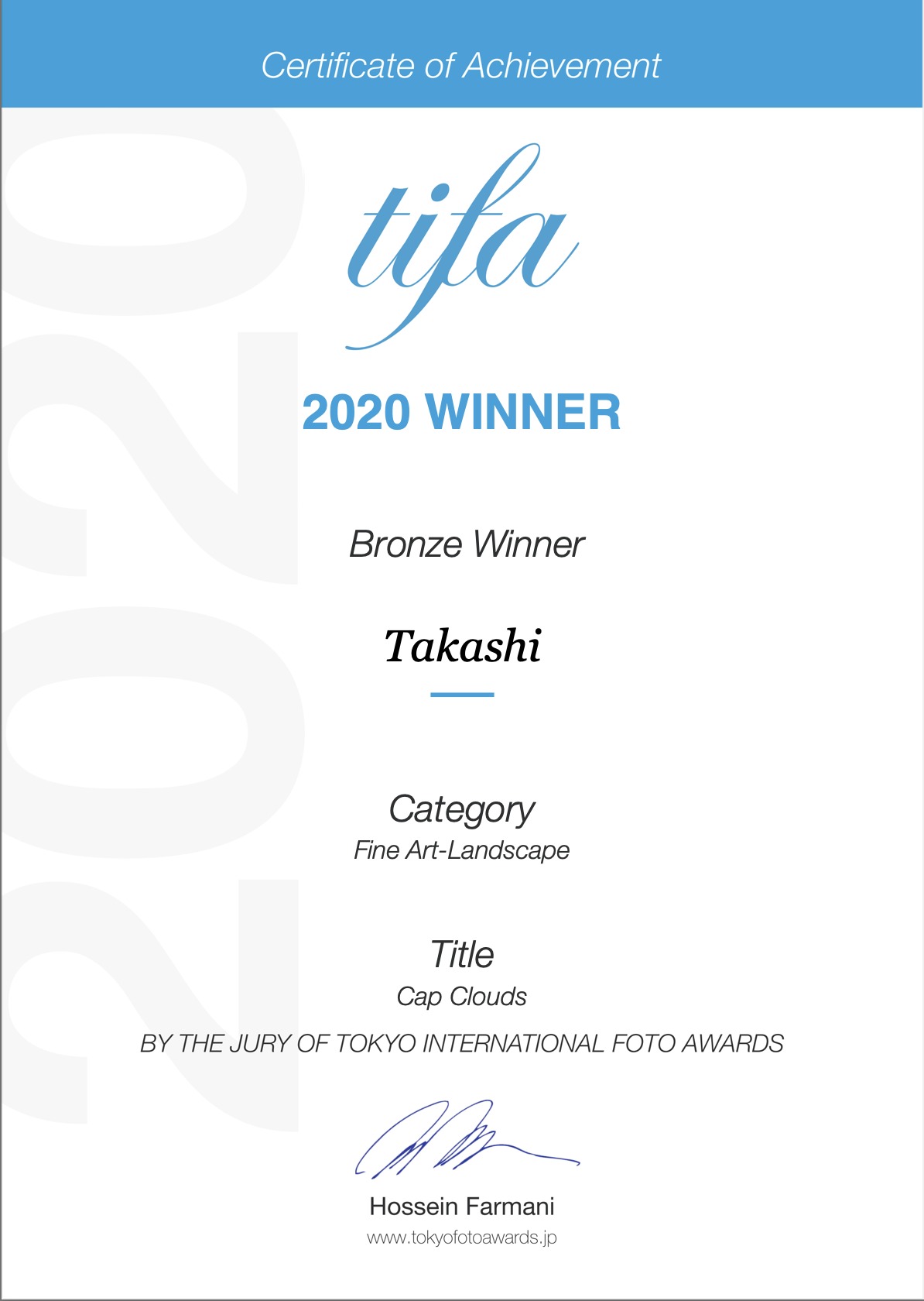 Tokyo を起点とした国際フォトコンテスト tifa 2020 (Tokyo Foto Awards 2020) で2つのSilver winner と2つの Bronze winner を受賞しました。